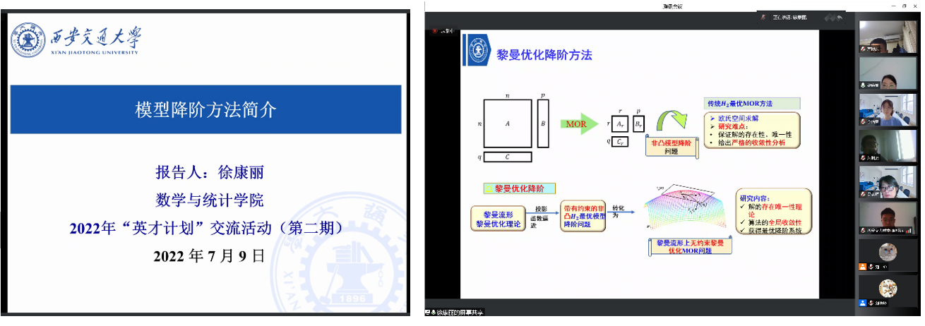第二场报告由徐康丽助理教授带来,报告的题目是“模型降阶方法简介”。徐老师从自己的科研方向出发,向同学们介绍了处理涉及大型或复杂动力系统的计算机设计、仿真、优化与控制的常用方法,重点介绍了“模型降阶”的主要思想。她采用简洁的图例,说明了在对模型进行降阶处理后,低阶模型仍然保持原始系统的重要动力属性,并且在一定衡量标准下降阶系统与原始系统的近似误差足够小。此外,徐老师还介绍了在工程控制领域处理线性时不变系统的平衡截断方法以及Krylov子空间方法。