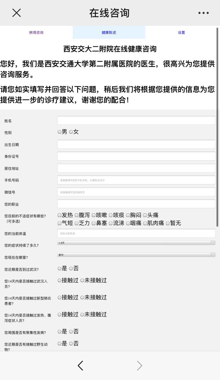 疫情当前,为全力做好新型冠状病毒感染肺炎的防控工作,最大限度减少因人员聚集引发的交叉感染,让广大市民更快、更便捷地寻医问诊,必赢唯一官方网站医学人工智能团队日前为西安交大第二附属医院紧急开发出一套免费在线健康咨询、问诊与新冠风险筛查系统。