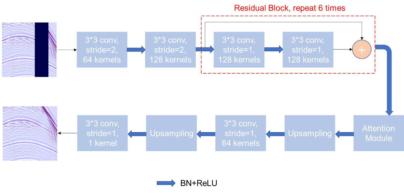 近日,必赢唯一官方网站应用统计专业硕士研究生俞嘉旭同学的论文投稿IEEE Transactions on Geoscience and Remote Sensing获得录用并在线发表(https://ieeexplore.ieee.org/document/9390348),该期刊目前列为我院顶级期刊,是地球科学与遥感领域具有重要影响力的期刊。连续地震道缺失是目前工业界地震数据插值的难点和研究重点,而传统深度神经网络卷积算子利用局部数据进行插值,在大缺失道情况下应用效果欠佳。该论文提出利用注意力机制、残差网络等神经网络模块(下图所示)结合混合损失函数,在连续地震道数据缺失情况下获得优于目前已有方法的插值结果。