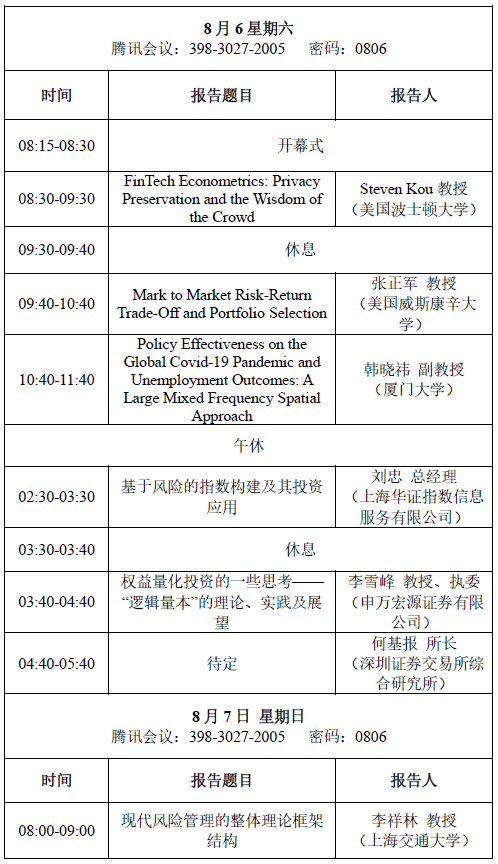 国家天元数学西北中心定于2022年8月6日-7日召开金融管理与风险控制论坛。受疫情影响,论坛全程在线上举办。该论坛是中心“随机分析与量化金融”主题年活动之一,由西安交通大学徐宗本院士顶层设计,邀请普林斯顿大学范剑青院士、中科院数学与系统科学研究院巩馥洲研究员、山东大学吴臻教授等共同组织召集。