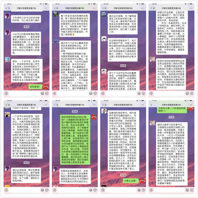 虽然是一次形式特殊的线上组织生活会,支部党员们研讨踊跃、发言不断,气氛热烈程度不亚于同处一室,党员们纷纷表达了自己对于本次疫情的感悟以及战胜疫情的信心。支部书记刘晓瑞同志表示,学习了习总书记的讲话后内心充满力量,习总书记对新冠病毒疫情做出的重要指示中一直强调把人民群众的生命安全和身体健康放在第一位,坚决遏制疫情蔓延。从疫情发展到今天,大家切实看到、感受到中央的决心和强有力的措施,疫情得到了有效控制,也得到了国际社会的高度认可,彰显了中国力量,中国效率,同时彰显了中国特色社会主义制度的优势。其他同志也在发言中表示通过学习习总书记重要讲话、浏览对本次疫情的报道,对中国政府强有力的领导、中国政党制度的优越和社会主义制度的优越有了直观的认识和切身的感受,我们党和国家在大事面前的魄力、决策力、行动力以及全国人民团结奋战的必胜决心。作为基层党员,在这个特殊阶段,更应该坚守岗位、做好本职工作,服务好学院师生,做好防护工作,关注疫情进展,为学校的疫情防控工作等重要工作贡献一份力量。