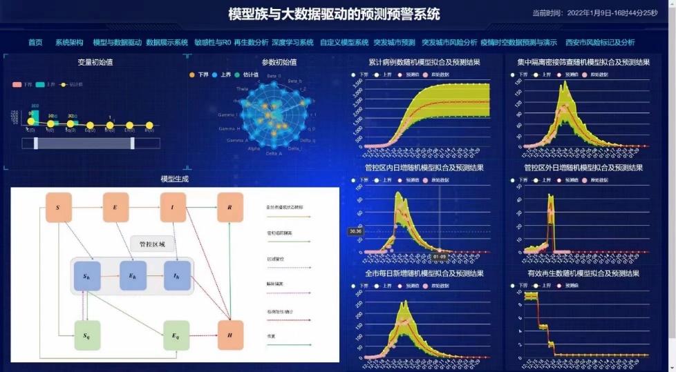 数学与生命科学交叉研究中心有着疫情传播分析的良好研究基础和优势,曾成功分析并预测了“非典”和武汉、广州、南京等地新冠病毒的流行趋势。疫情爆发后,中心成员迅速集结科研骨干,联合陕西师范大学生物数学团队、自然资源部陕西基础地理信息中心、西安市疾病预防控制中心、陕西省疾病预防控制中心等多家单位,全力开展疫情防控科研攻关。通过数据对比分析、模型构建与辨识,开发西安疫情防控可视化系统,为精确施策、防控、解封等提供了重要的决策支撑。