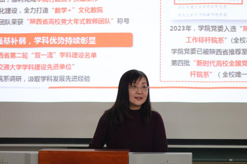 党委书记颜莉代表领导班子对学院2023年的工作亮点进行了总结,并就学院党委工作和个人情况进行述职述廉。2023年,学院党委深入学习党的二十大精神,扎实开展学习贯彻习近平新时代中国特色社会主义思想主题教育,始终坚持党建和中心工作深度融合,学院党委入选“陕西省党建工作标杆院系”,数学学科入选陕西省第二轮“双一流”学科建设名单,学院也荣获“西安交通大学学科建设优秀单位”,同时学院在人才培养、科学研究、队伍建设等方面也取得了许多亮点成绩。今后,学院党委将继续发挥政治核心作用,全面贯彻落实党中央、学校重要决策部署,团结带领学院师生,坚持围绕中心抓党建,持续推进党建和中心工作双融合、双提升,以高质量党建引领推动学院各项事业高质量发展。