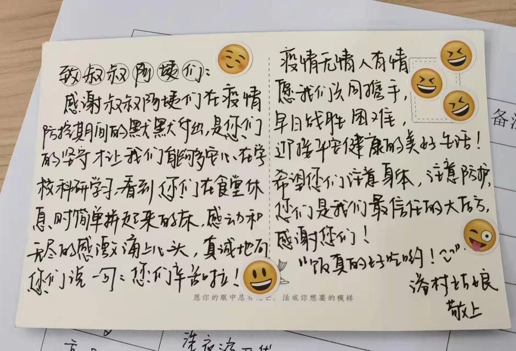 参与行动的龚若林同学说:“何其有幸能够参与到此次暖冬行动,通过学院采购及学生募集的形式,为食堂工作人员们献出一份绵薄之力。为了保障学生的生活需求,他们不畏艰险,选择了坚守岗位,与我们一起封闭在校区内,我们也应理所应当地为他们送去温暖,互帮互助,携手战疫。”王琪同学表示,通过与食堂工作人员进行交流,了解到他们为了保障师生就餐,需要早上三点多开始上班,晚上10点才能下班休息,因此食堂成了他们工作与生活的地方。他说:“相信在全体交大师生的共同努力下,我们一定能够打赢这场抗疫攻坚战。”