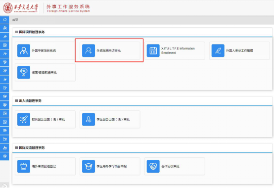 西安交通大学外事工作服务系统:http://ims.xjtu.edu.cn/Main/LeftMenuT.do
